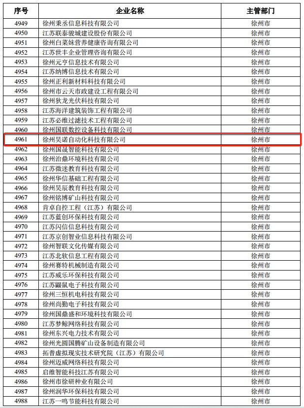 根據(jù)江蘇省科學(xué)技術(shù)廳、江蘇省財政廳關(guān)于公布江蘇省高新技術(shù)企業(yè)培育庫2020粘度入庫企業(yè)名單的通知,為貫徹落實省政府引發(fā)的《江蘇省推進高新技術(shù)企業(yè)高質(zhì)量發(fā)展的若干政策》,深入實施高新技術(shù)企業(yè)培育“小升高”行動計劃,進一步加強高新技術(shù)企業(yè)培育,經(jīng)企業(yè)申報、專家評審、網(wǎng)上公示、地方審查推薦等程序,確定了15148家企業(yè)作為省高新技術(shù)企業(yè)培育庫2020年度入庫企業(yè)。根據(jù)通知附件《江蘇省高新技術(shù)企業(yè)培育庫2020年度入庫企業(yè)名單》,4961號為徐州昊諾自動化科技有限公司。